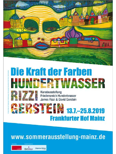 Die Ausstellung „Die Kraft der Farben“ präsentierte die kraftvollen Werke der Künstler Friedensreich Hundertwasser, James Rizzi and David Gerstein vom 13. Juli bis zum 25. August 2019 im Frankfurter Hof in Mainz. Zum ersten Mal wurden die Werke dieser drei Künstler gemeinsam ausgestellt und in einen farbenfrohen Dialog gebracht.