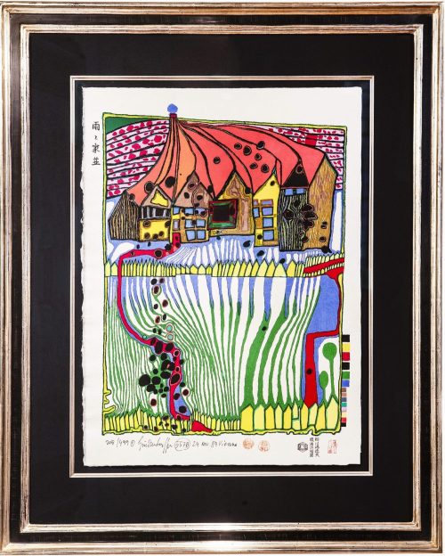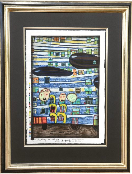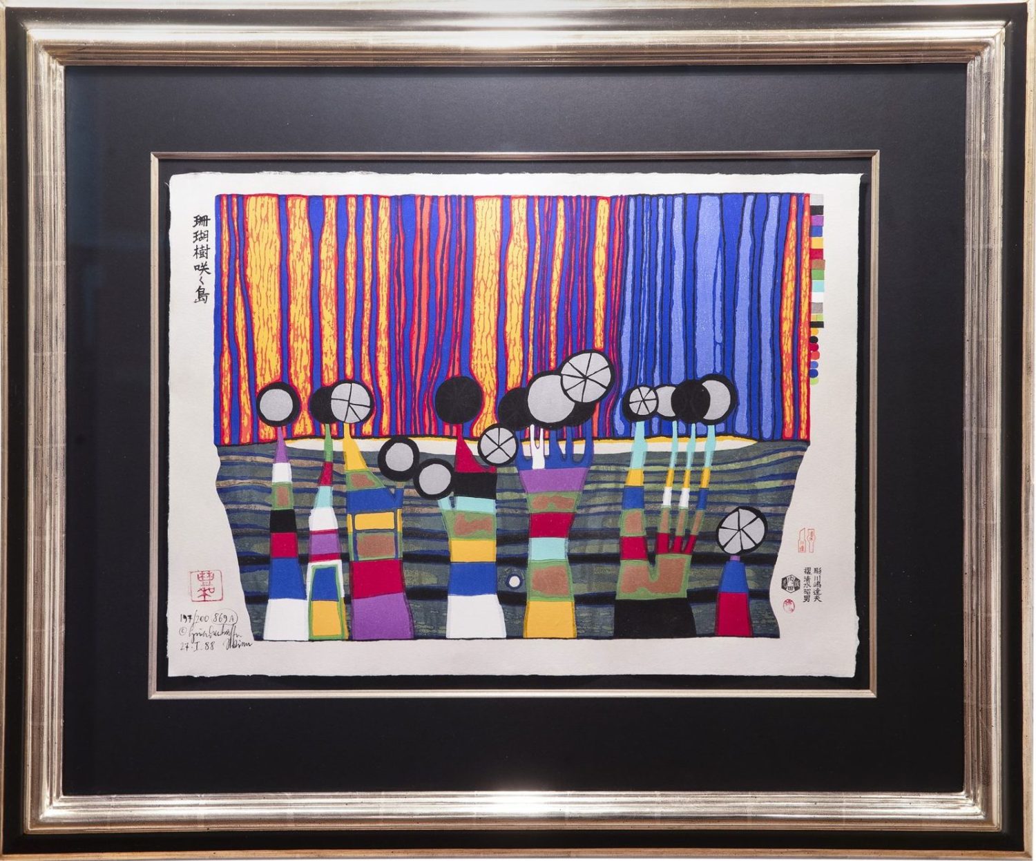 Technik Farbiger Holzschnitt und Metallprägung auf Japanbütten.
