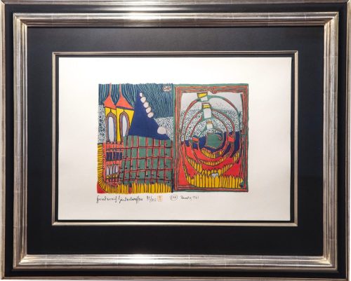 Farbiger Holzschnitt und Metallprägung auf Japanbütten. |