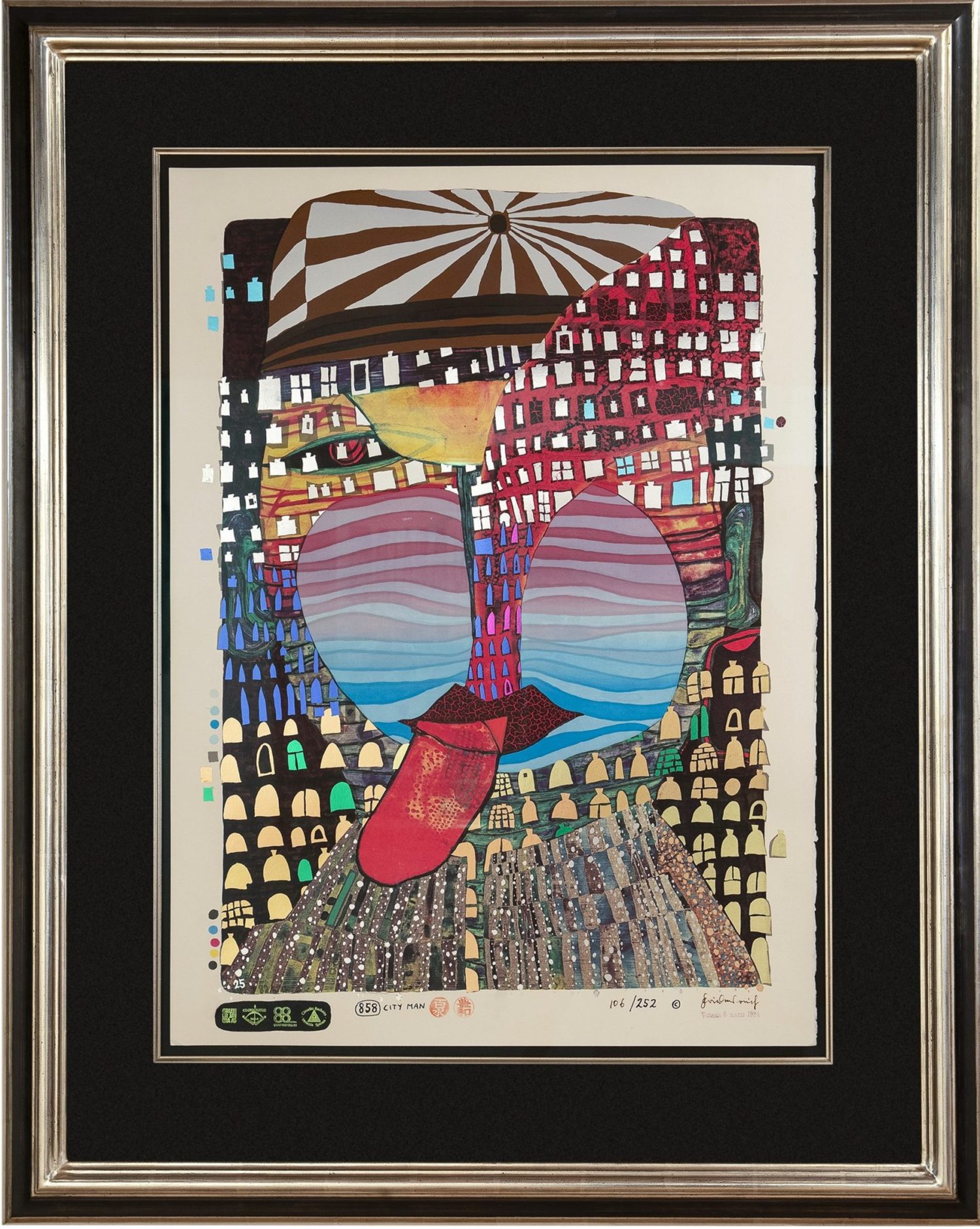 Technik Mixed media: Fotolithographie von Zink in 4 Farben, Serigraphie in 13 Farben, Metallprägungen in 9 Farben (41 Druckvorgänge).